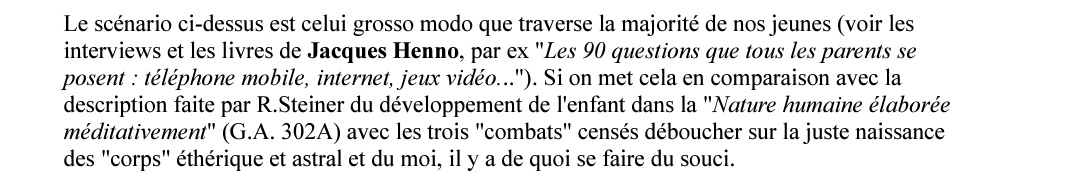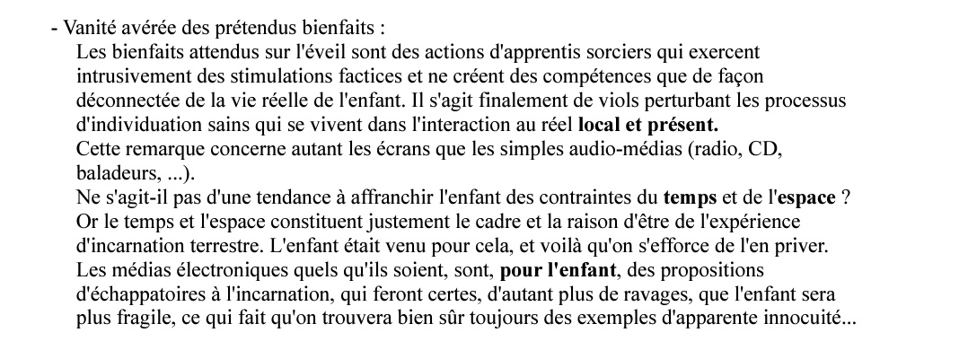 Ici aussi, l'auteur parle des écrans et autres médias comme un frein à l'incarnation terrestre de l'enfant (donc un frein au dvp des corps subtils).