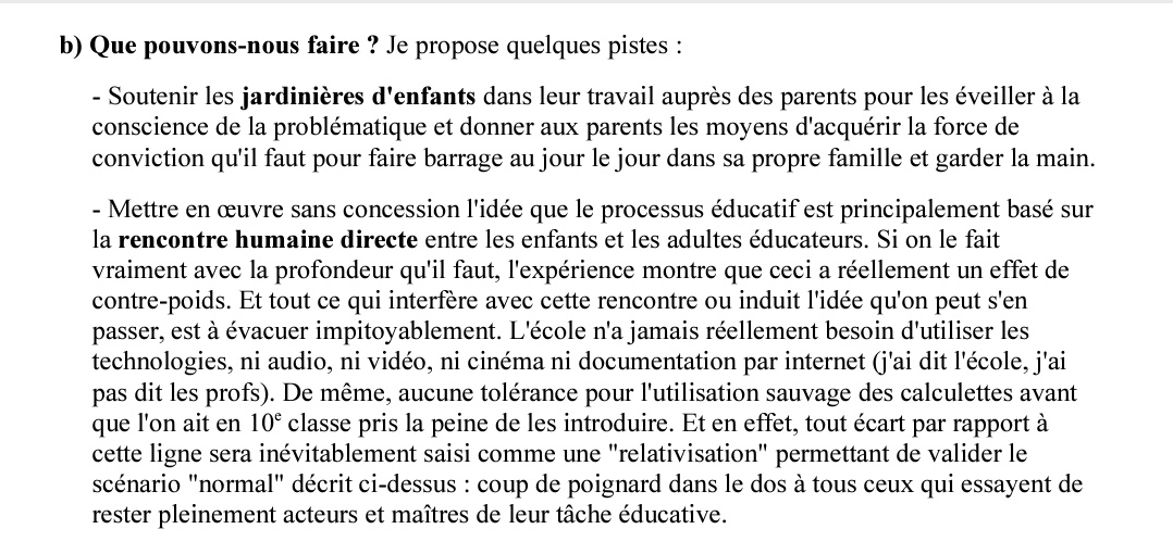 Selon P. Paccoud, les jardinières d'enfants doivent donc sensibiliser les parents aux supposés dangers des écrans pour les jeunes enfants, sans doute sans expliquer derrière qu'elles s'appuient sur les délires de R. Steiner.