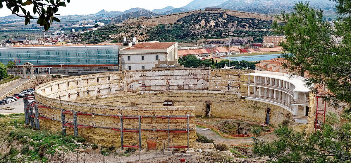 El anfiteatro de Cartagena se levantó en época Flavia (2ª mitad s. I d.C.) sobre una estructura anterior, con capacidad para unos 10.000 espectadores. Con el tiempo se fue desmantelando hasta que sus estructuras quedaron ocultas bajo la plaza de toros construida en 1854.