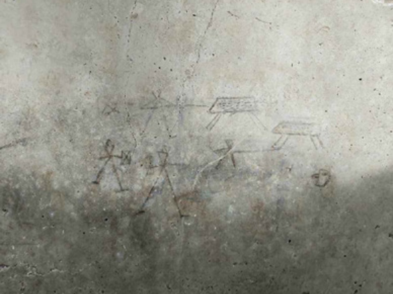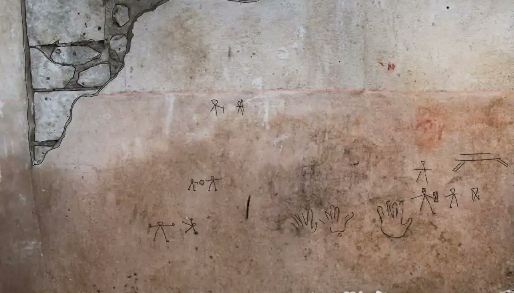 Es en la Casa del II Cenacolo donde han aparecido los grafitis. La simplicidad de líneas e iconografía y la representación de unas manos, ha llevado a los investigadores a concluir que fueron elaboradas por unas manos infantiles, de unos 5 a 7 años aprovechando obras en la casa.