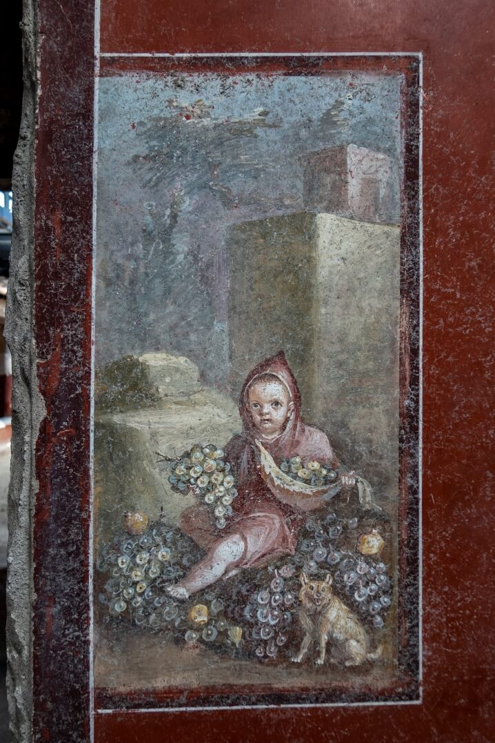 Y este bellísimo e inusual retrato de un niño con capucha y capa de viaje, con un gracioso perro a su lado y rodeado de uvas y granadas. Seguramente se trate del hijo de los dueños de la casa, retratado en perspectiva con la zona de apertura al tripórtico.