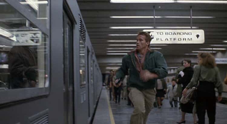 Arnold injured himself during the shoot. Filming the scene where Quaid smashes a train window, the glass explosive misfired, injuring his hand. And filming the fight in the hotel room, Arnold broke his finger and had a cast fitted.