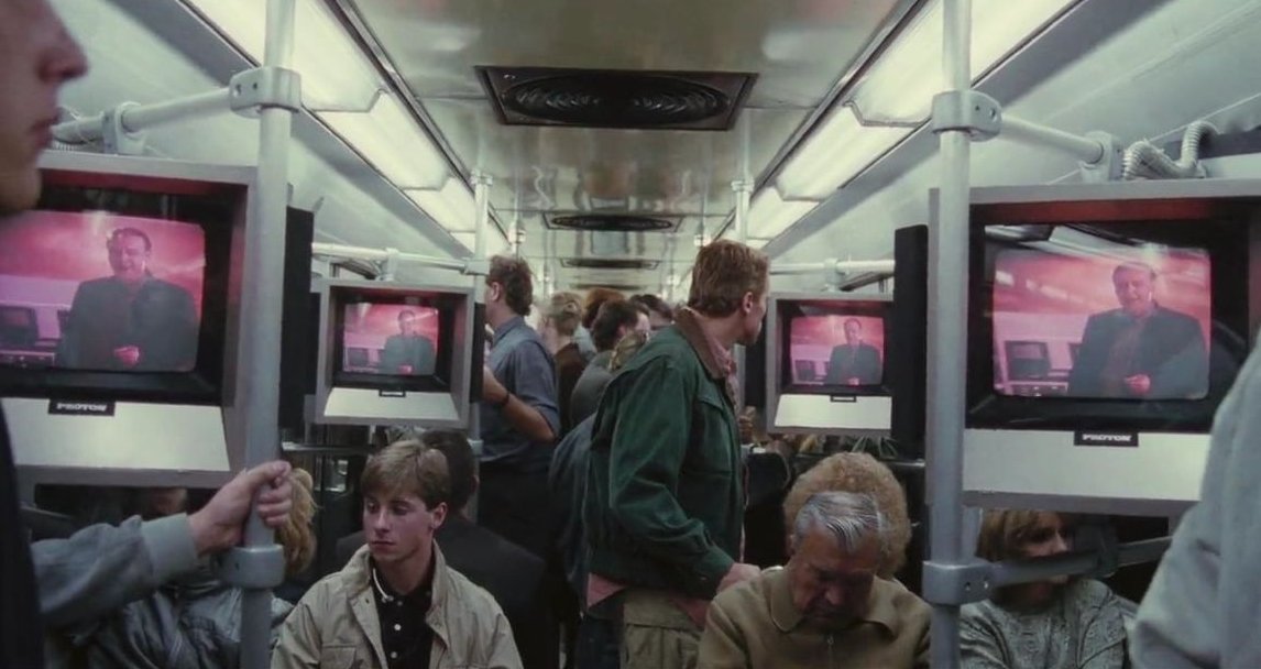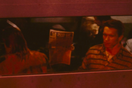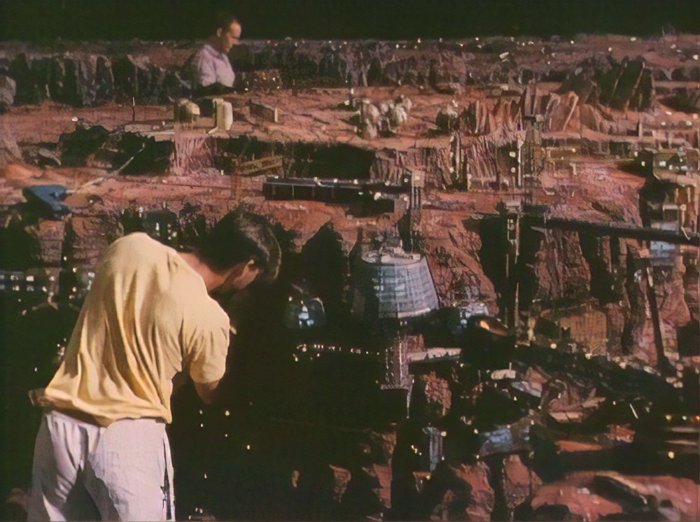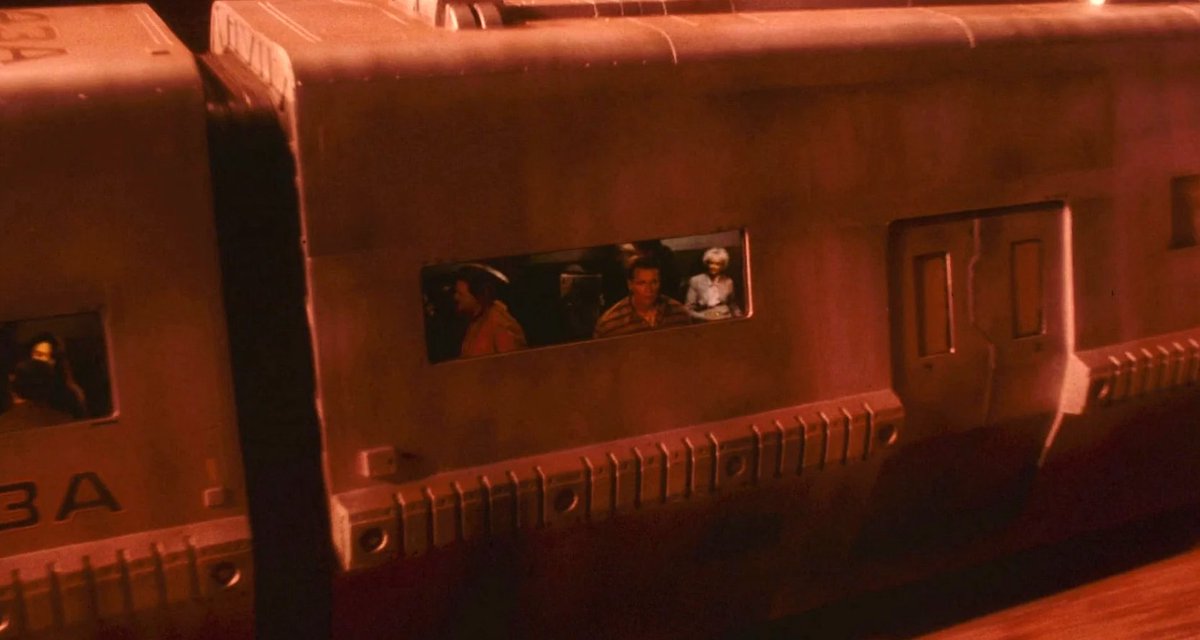 The shot of Quaid traveling by train on Mars where we swoop over the Martian mountains was also going to be cut until Arnold stepped in. It was carried out by placing a 7 inch screen inside the model train and playing pre-recorded footage of Arnold on it.