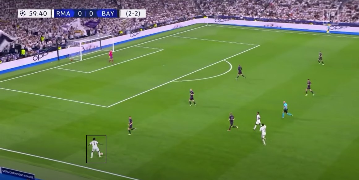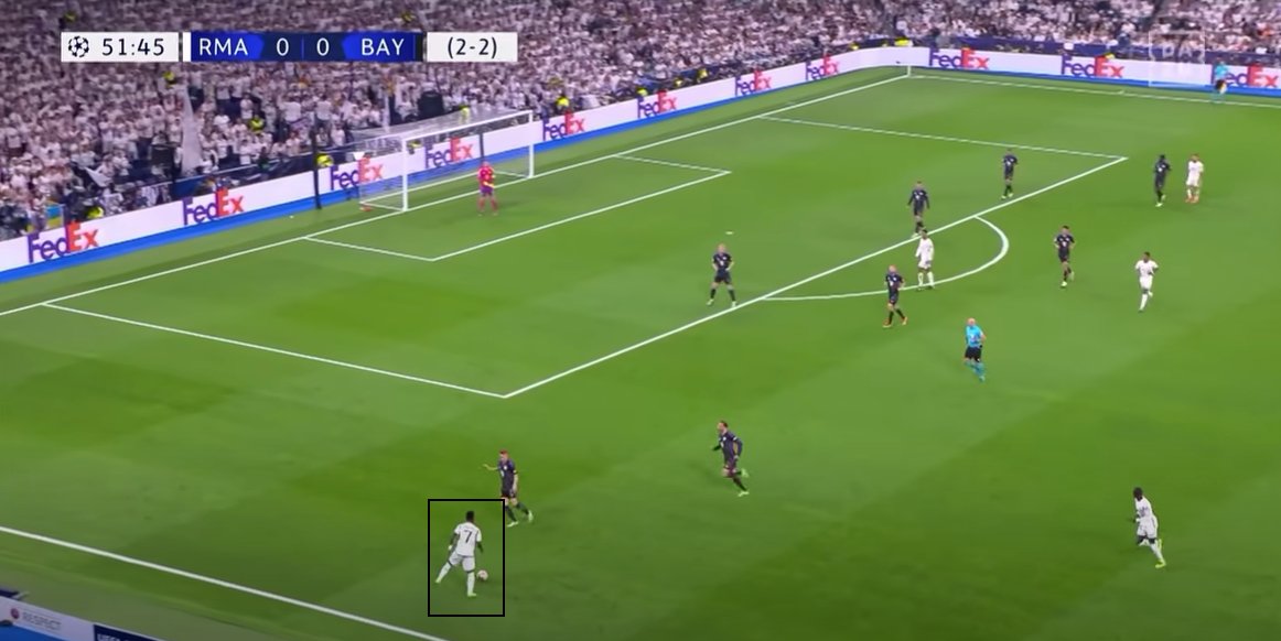 Gegen den FC Bayern schaffte Vinicius dies bspw. durch ein Entgegenkommen & sofortigen Richtungswechsel, bei dem Kim nicht mitgehen konnte & die Absicherung der gesamten Defensive nicht stimmte. ->