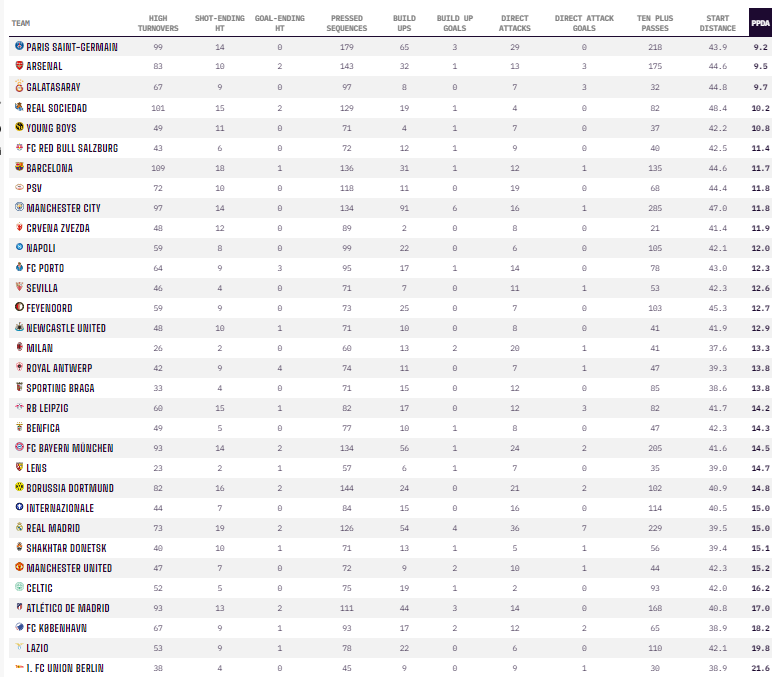 Real ist grds. eine abwartende Mannschaft. So befindet man sich sowohl in Liga (8) als auch CL (25) nicht unter den Teams mit niedrigem PPDA. In La Liga sind die PPDA niedriger als in der CL, wo Real gg Topteams tendenziell eher abwartend agiert. ->