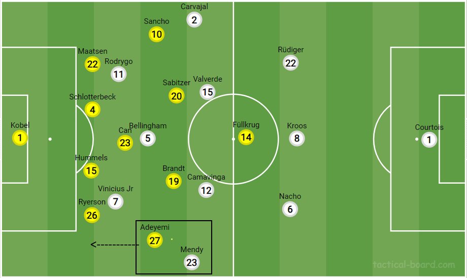 Wie oben beschrieben wird es wichtig für den BVB das Zentrum zu schließen, sodass Real den Ball nicht durch die Mitte nach vorne bringen kann, sondern auf die Flügel weichen muss. Sollte dies gelingen würde Joselu jedoch nochmal eine andere Dimension in das Spiel bringen.