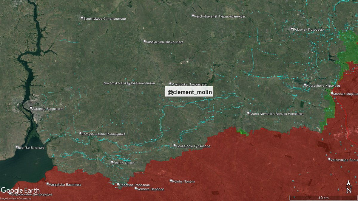 Here is Zaporijia city, (you have to click to zoom it). These defenses are mostly old ones from 2022 and 2023, but you'll see there are 2 main lines just south of it.