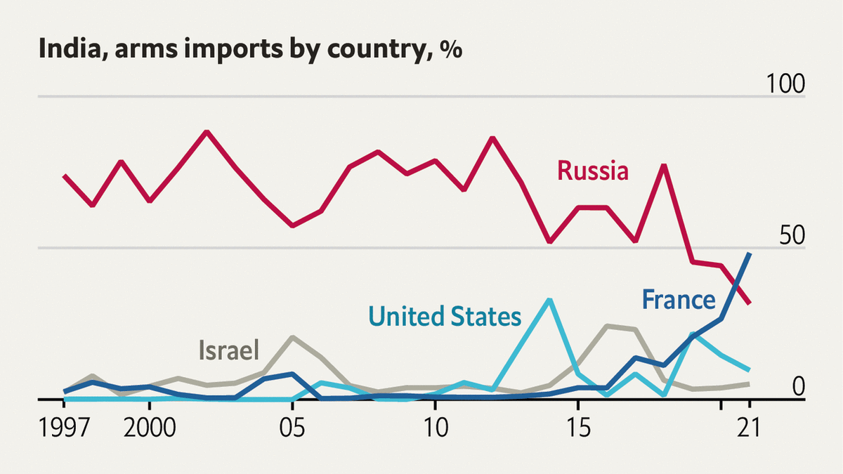 Mitte der 2010er schwenkt Indien um und kauft statt russichen Jets französische Rafale. Auch das Joint Venture bei der Su-57 storniert Indien. 5/21