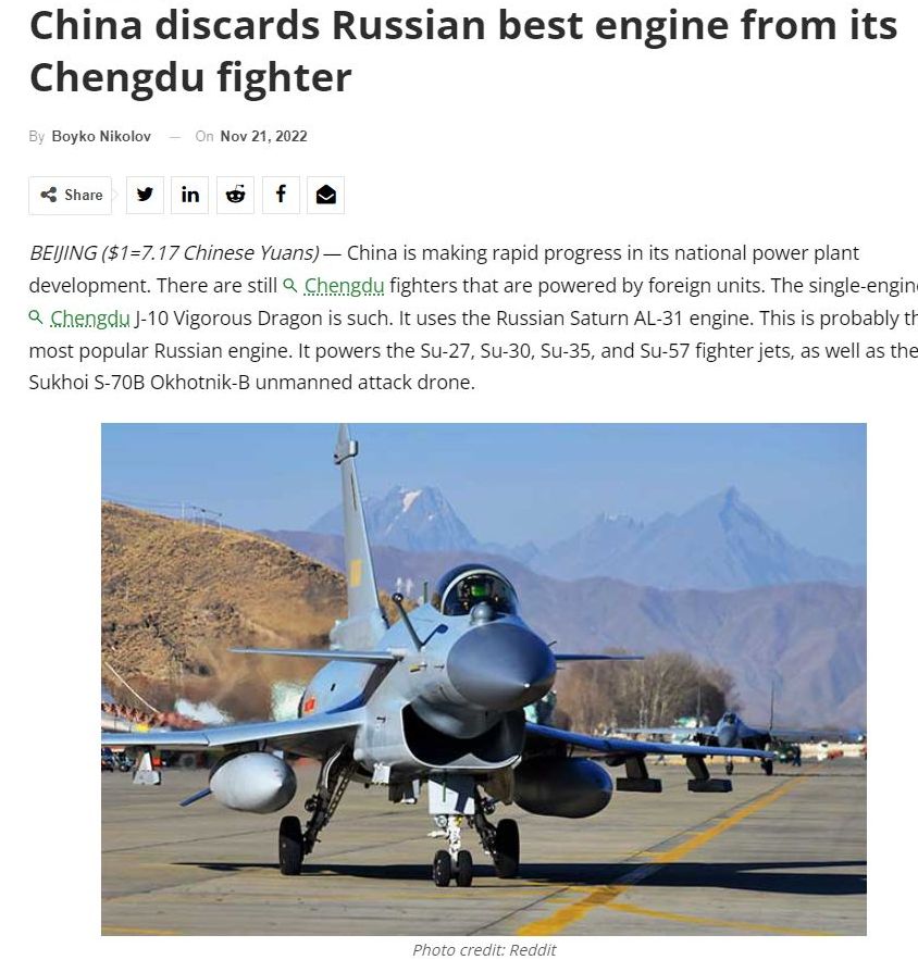 Als jüngste Entwicklung wird China von russicher Triebwerkstechnologie autark. Die chinesischen Flanker haben alle noch russische Treibwerke, auch die J-10 und auch die erste Version der Xian Y-20. 12/21