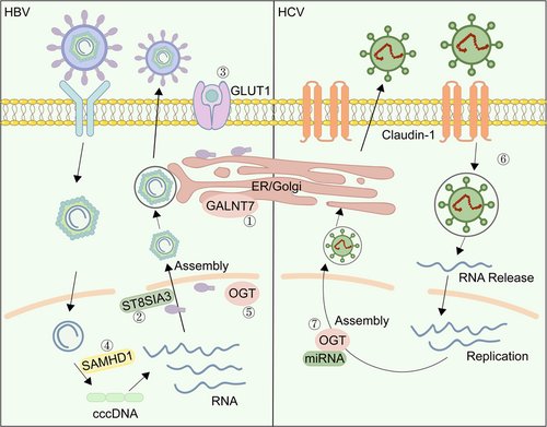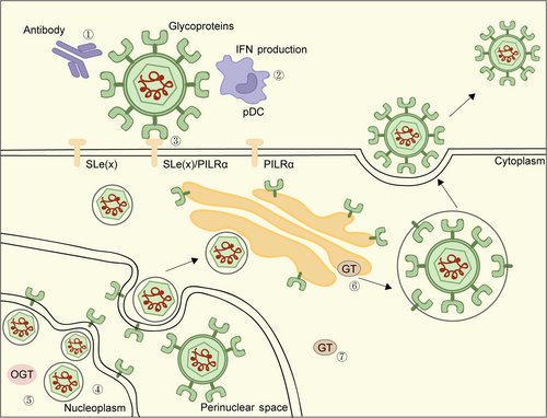 3) It plays key roles across the viral life cycle, including entry, assembly, spread, and immune evasion. Studies show O-glycans on HBV, HSV, KSHV, HTLV-1, IV, and SARS-CoV-2 proteins facilitate entry, while modifications on EBOV, HCV, HIV-1, HeV help evade neutralization.