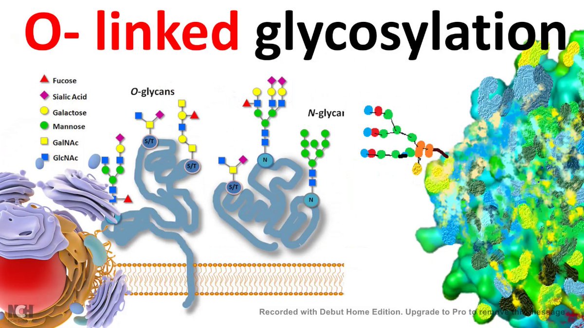 2) O-glycosylation is the enzymatic attachment of sugars like N-acetylgalactosamine or N-acetylglucosamine to serine or threonine on proteins. It occurs in the Golgi or cytoplasm O-glycosylation plays roles in diverse processes in viruses and their host organisms.