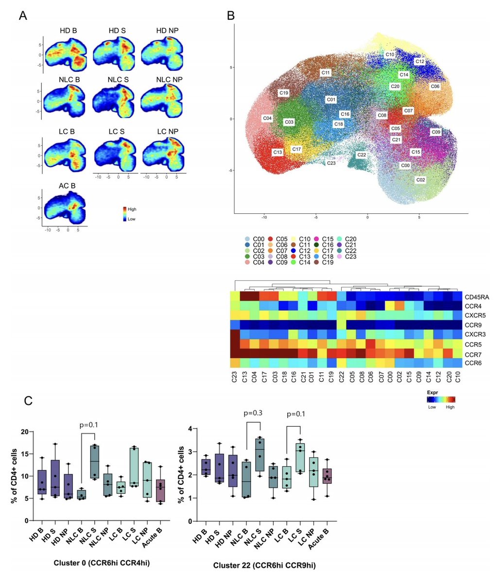 2)This study analyzed T cell subsets in long-COVID (LC) patients compared to non-LC. Unsupervised analysis revealed increased Th17-like clusters expressing CCR6 and CCR4 in non-LC after SARS-CoV-2 stimulation. LC patients had fewer activated SARS-CoV-2-specific CCR6+ CD4+ T cells