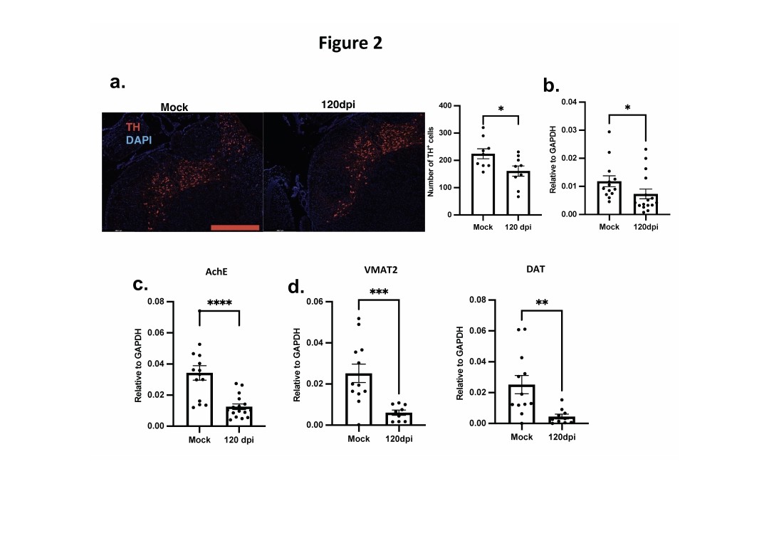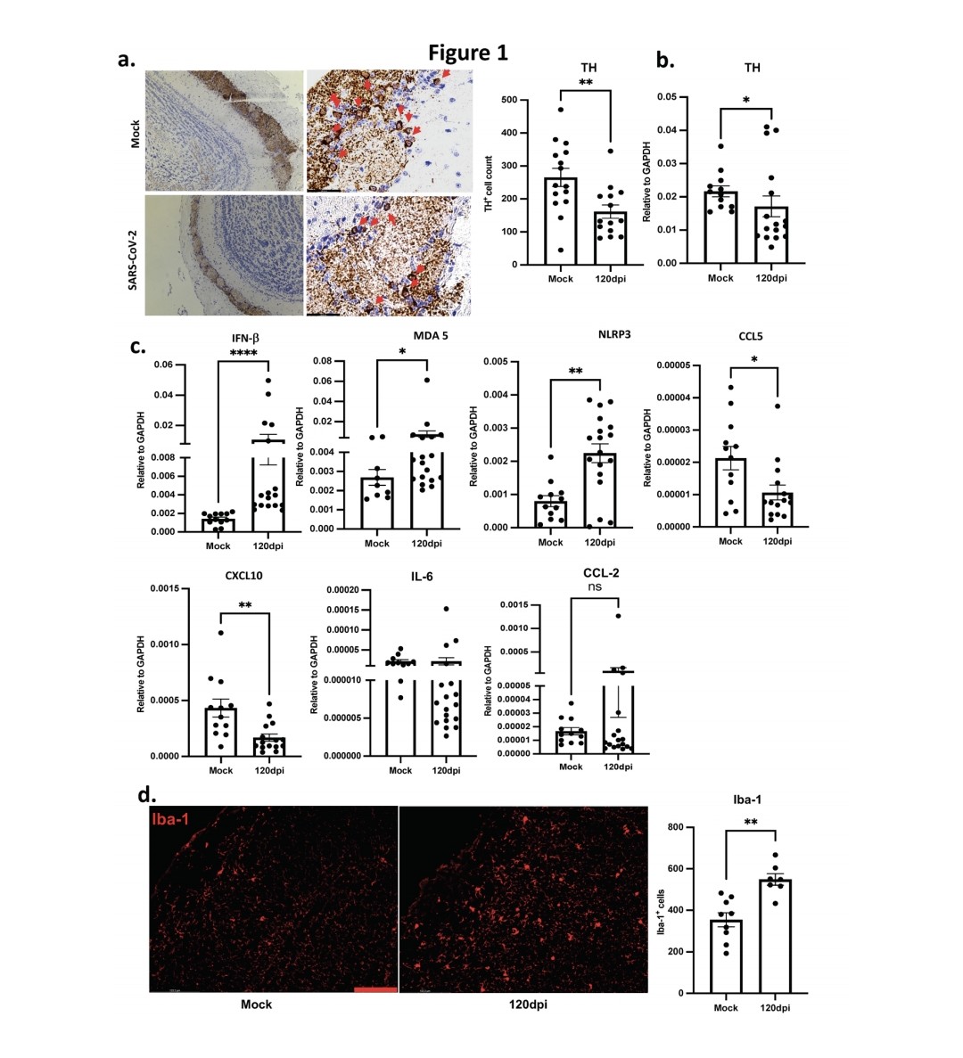 3) In the olfactory bulb, they observe decreased levels of tyrosine hydroxylase, a marker for dopamine production. This is accompanied by higher levels of pro-inflammatory cytokines and activated microglia cells.