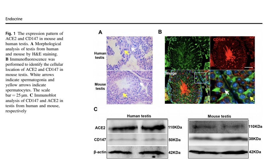 2) COVID-19 appears to impact male fertility through infection of testicular cells. The study found that the SARS-CoV-2 spike protein (S-protein) can invade mouse spermatogonia (GC-1) cells through interaction with the ACE2 or CD147 receptors.