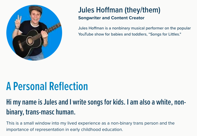 7/ Jules, and perhaps even Ms. Rachel herself, believes in the idea of “representation.” Whether they include an overt lesson on gender ideology in your children’s content or not, Jules’ ambiguous physical presentation in the show IS the point.