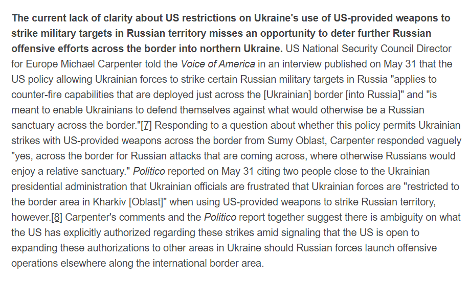 2/ Recent comments from US officials and media reports suggest there is ambiguity on what the US has explicitly authorized regarding these strikes amid signaling that the US is open to expanding these authorizations to other areas in Ukraine should Russian forces launch offensive operations elsewhere along the international border area. ⬇️