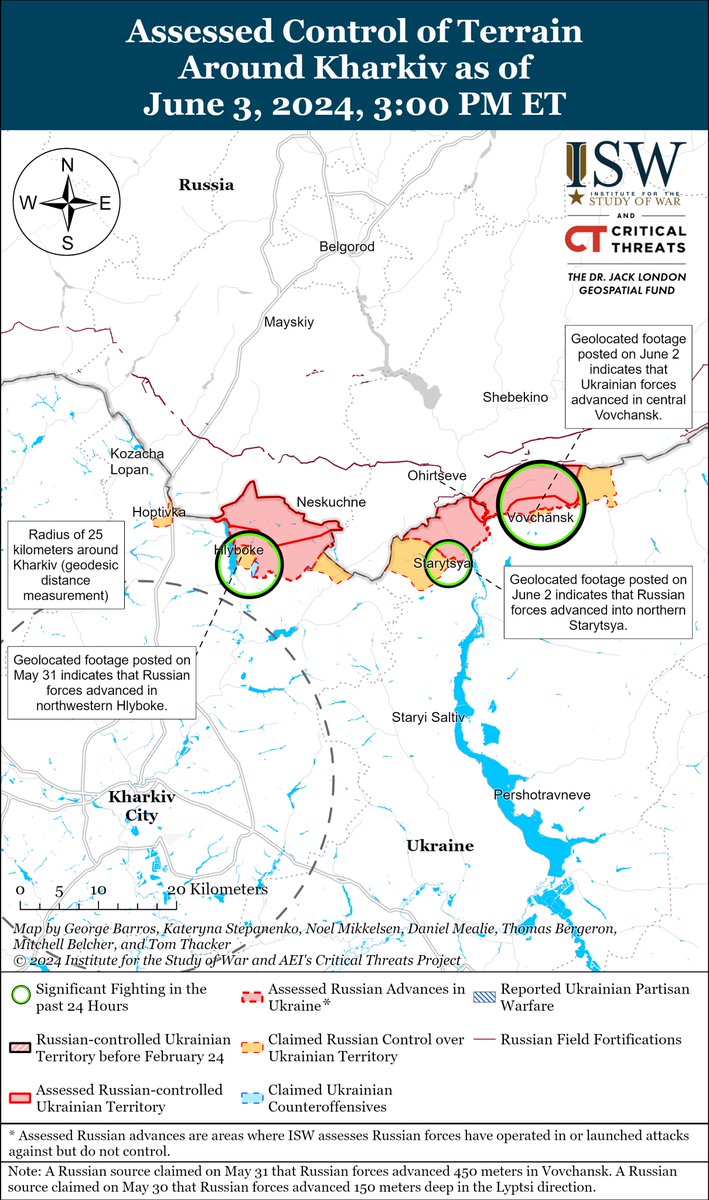 2/ Geolocated footage published on May 31 shows that Russian forces advanced to buildings along Studentska Street in northwestern Hlyboke (north of Lyptsi). Footage published on June 2 shows that Ukrainian forces regained a position along Dukhovna Street in central Vovchansk.