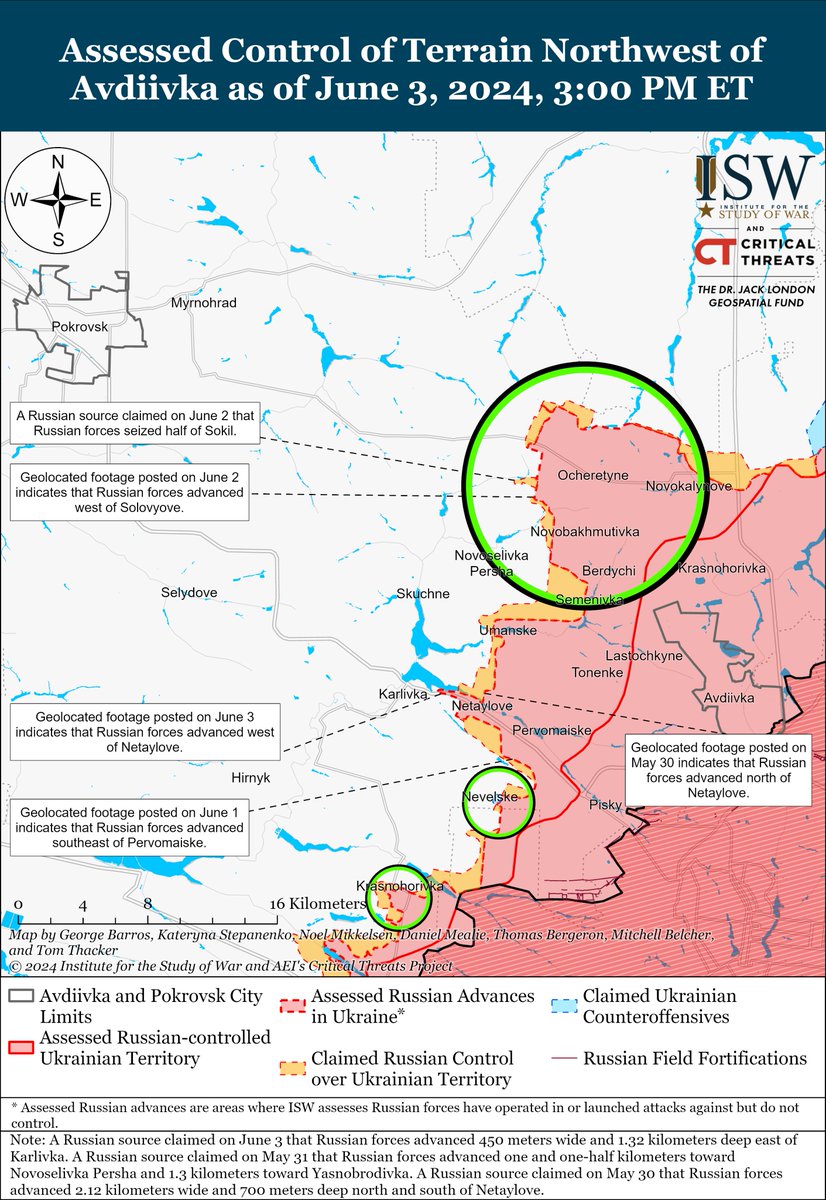 3/ Geolocated footage published on June 3 shows that Russian forces have advanced along the M-30 highway west of Netaylove (west of Avdiivka) approaching Karlivka, and Russian milbloggers claimed that Russian forces advanced east of Karlivka.