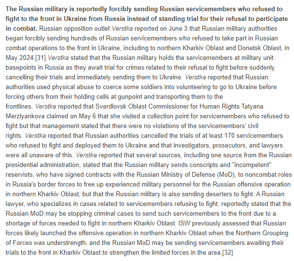 3/ The Russian military is reportedly forcibly sending Russian servicemembers who refused to fight to the front in Ukraine from Russia instead of standing trial for their refusal to participate in combat.