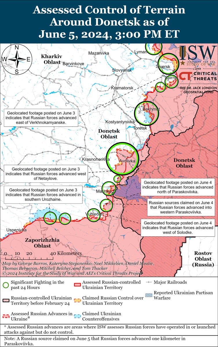 4/ Geolocated footage published on June 3 shows that Russian forces advanced within southern Urozhaine (south of Velyka Novosilka), and geolocated footage published on June 1 indicates that Russian forces recently advanced northeast of Robotyne.