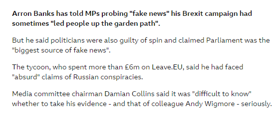 In June 2018, Banks used his appearance before the Commons media select committee to say there was "not one shred of evidence" he was involved in a conspiracy with Russian officials. Leave.EU