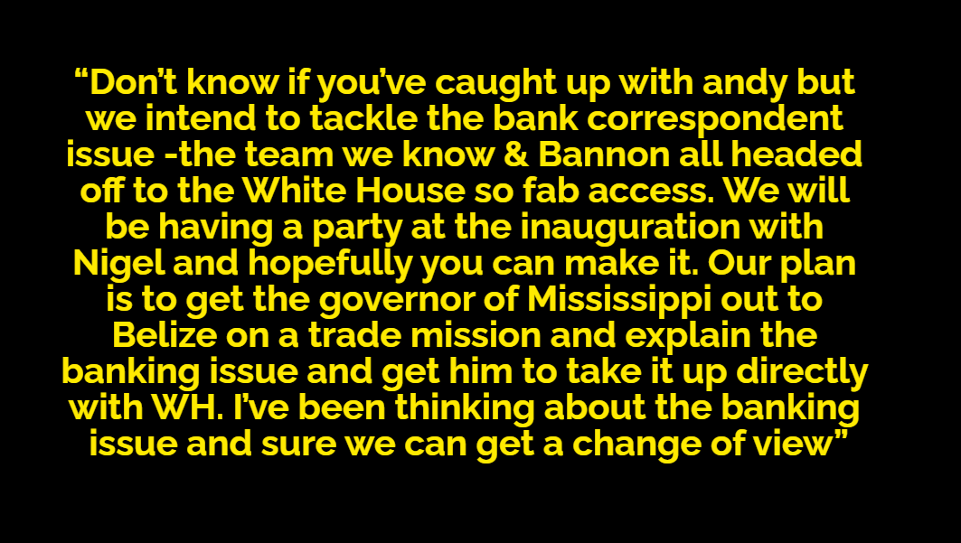 Banks discussed a plan to work with then-Mississippi Governor Phil Bryant to restore support for transactions in US dollars to Belize Bank.