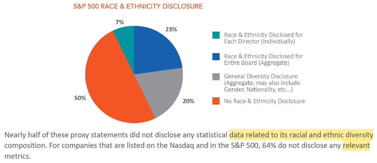 /3 In its Racial & Ethnic Diversity in the Boardroom report, Glass Lewis states that 64% of companies listed on the Nasdaq and S&P 500 do not list “relevant” metrics about directors’ race and ethnicity in their proxy statements. Even so, Americans should be concerned that more than a third of these companies are still beholden to the woke dogmas that demand discrimination in the name of diversity and equity.