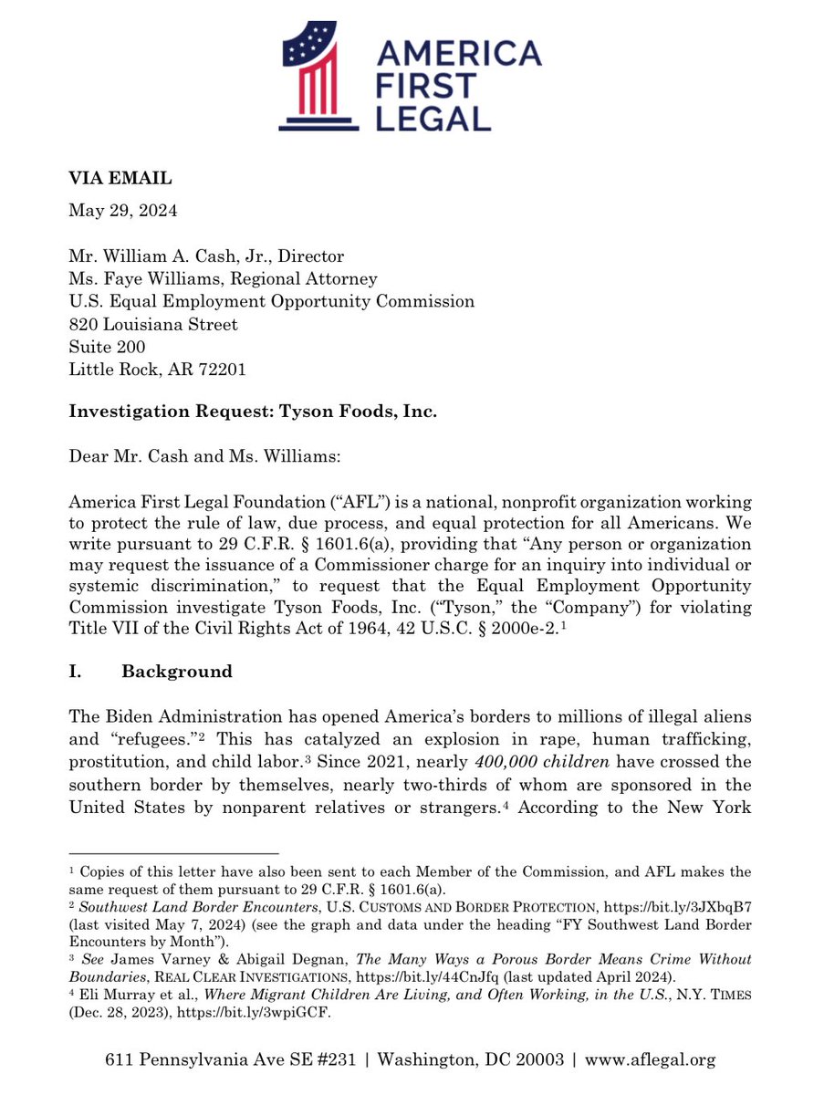 /2 In light of shocking evidence of significant potential violations of law, our Center for Legal Equality filed a series of complaints related to the employment practices of Tyson Foods.