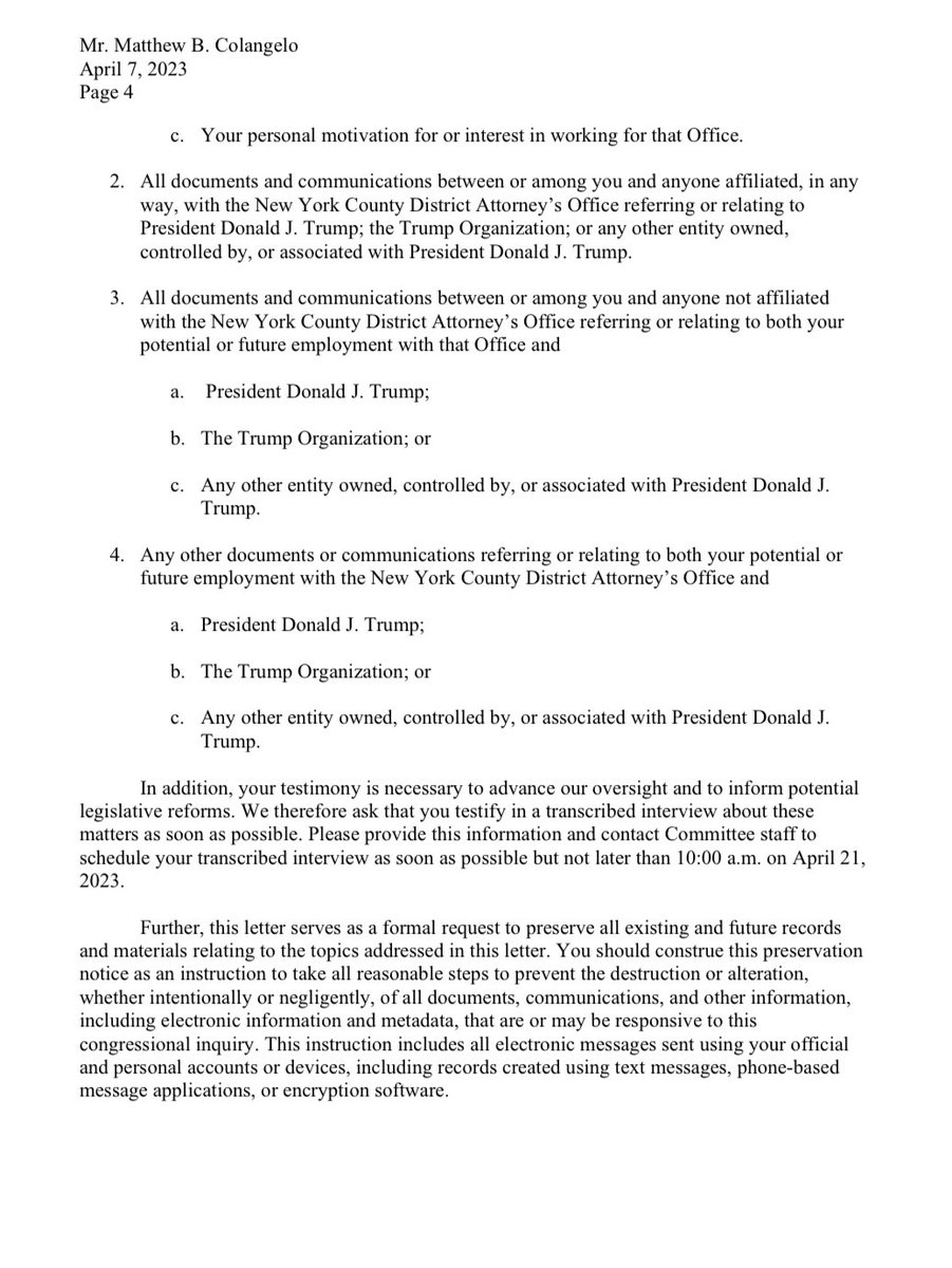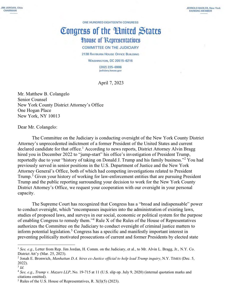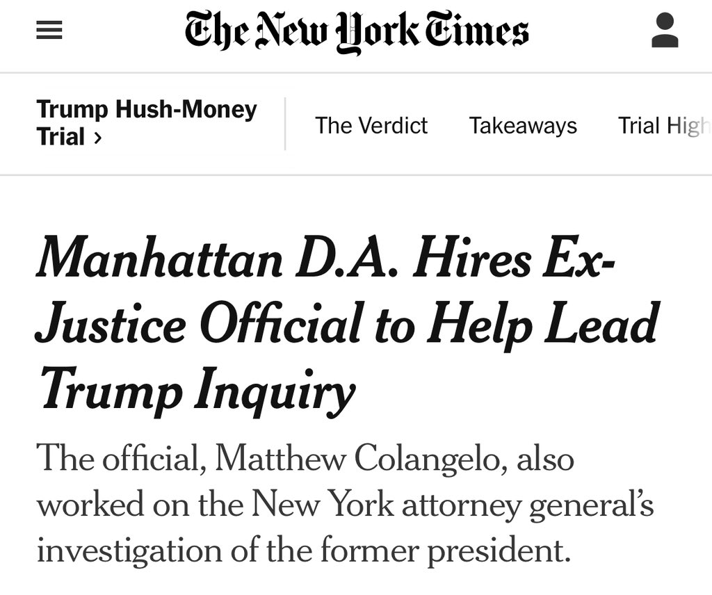 /2 In December 2022, New York County District Attorney Alvin Bragg hired Matthew Colangelo to reportedly “jump-start” his office’s investigation of President Trump, reportedly due to Mr. Colangelo’s “history of taking on Donald J. Trump and his family business.”