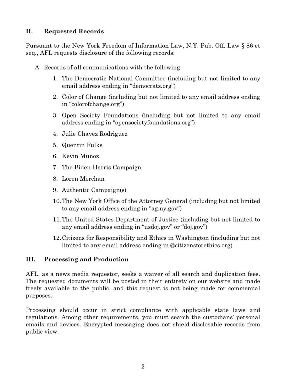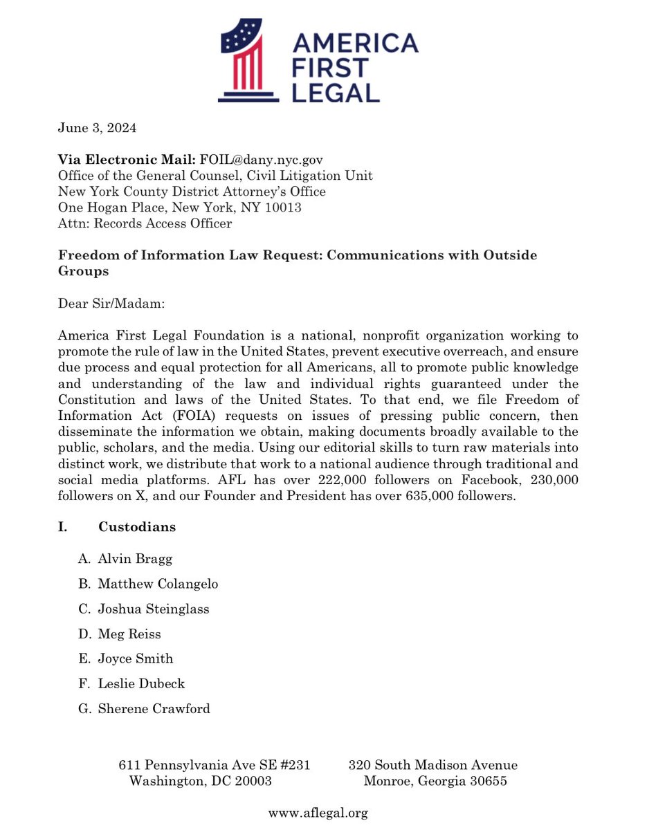 /2 Responding to credible allegations of improper collusion between District Attorney Alvin Bragg’s office, the Biden White House and DOJ, and allied leftist dark money groups, AFL has filed 3 new New York State Freedom of Information Law (FOIL) demands…
