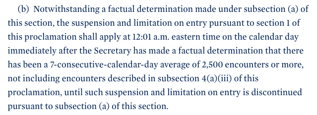 In short, the new EO establishes a "floor" of illegal immigration only triggered when there are 2,500 daily encounters or more over a 7-day period. Do the math = roughly 76,041 each month.