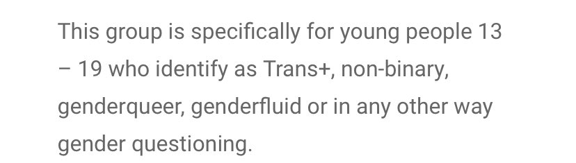 The charity runs projects for “young people 13-19 who identify as Trans+, non-binary, genderqueer, genderfluid or in any other way gender questioning”.