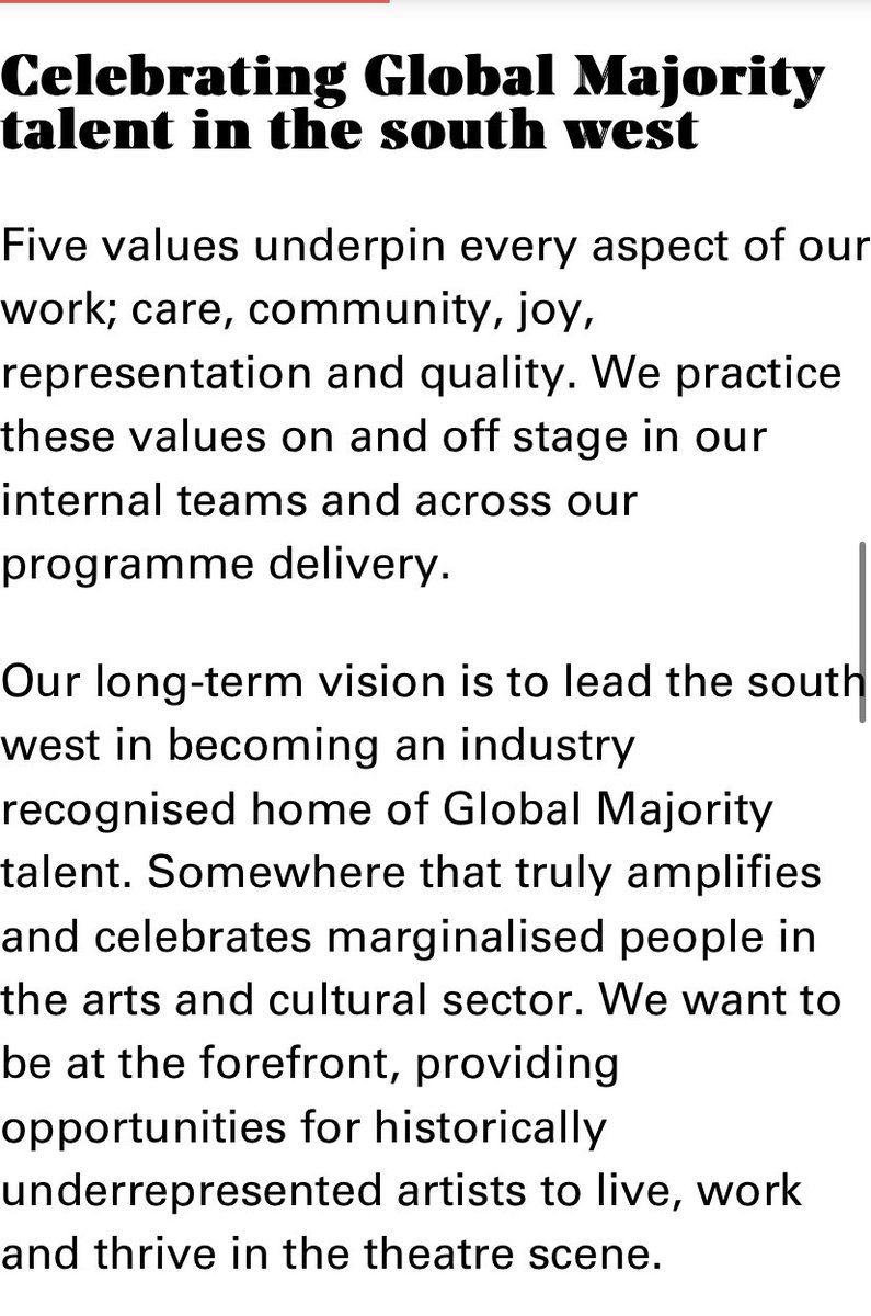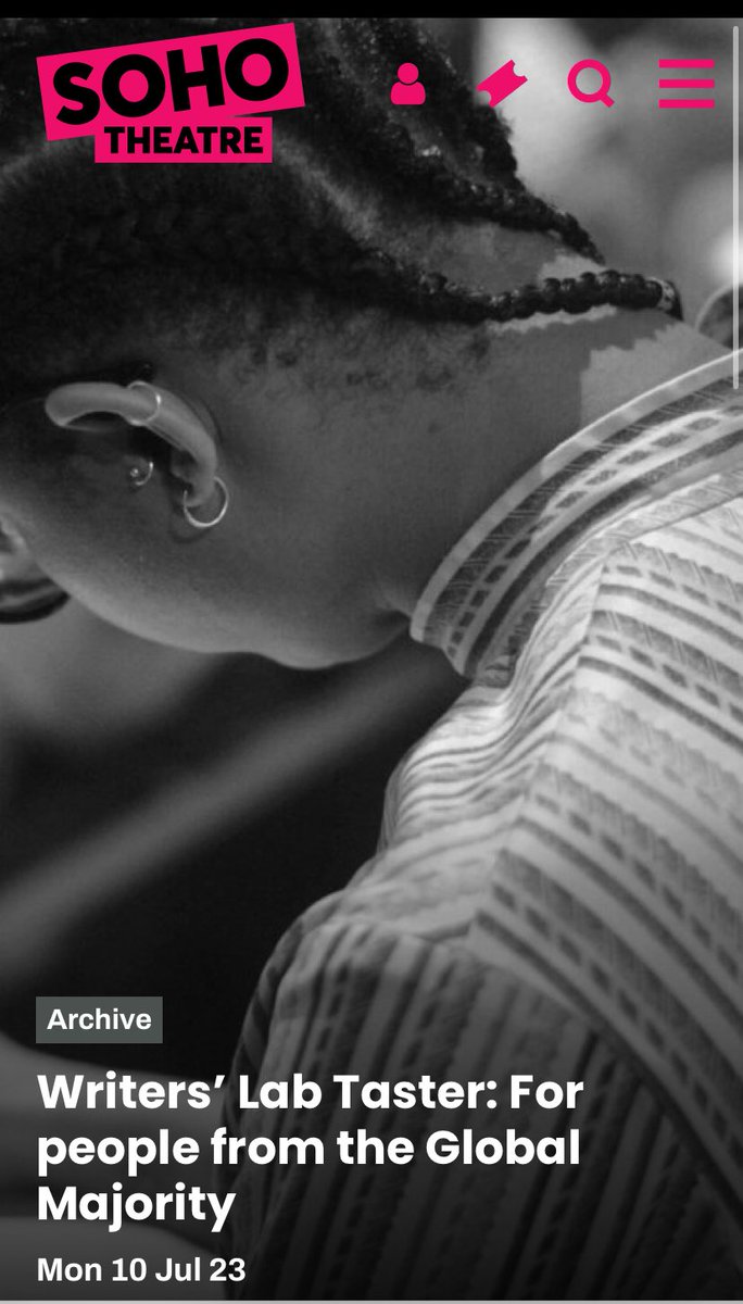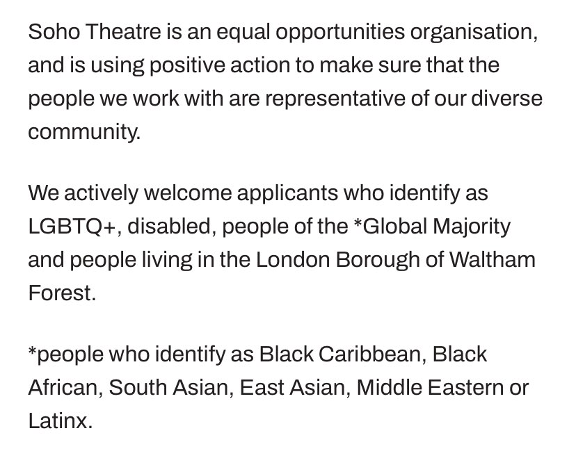 2) Soho Theatre “We actively welcome applicants who identify as LGBTQ+, disabled, people of the *Global Majority and people living in the London Borough of Waltham Forest.”