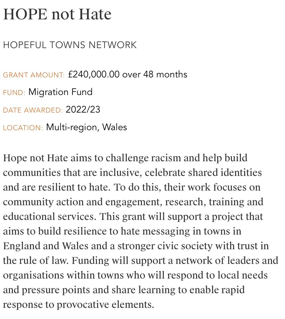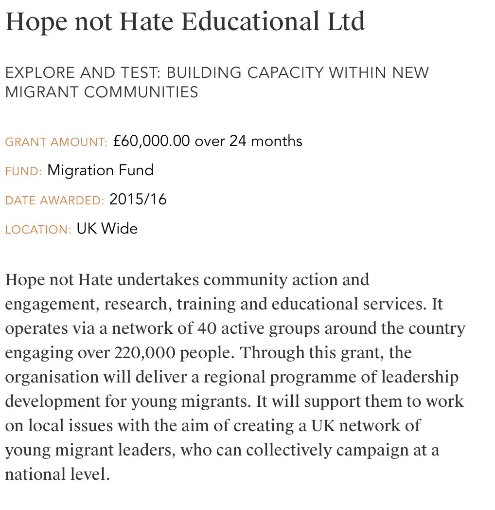 It also has a "Migration Fund", which HOPE not hate has received three times (worth hundreds of thousands of pounds).