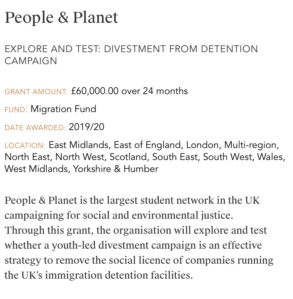In 2020/21, PHF awarded £60,000 over 24 months to a student network wanting to "remove the social licence of companies running the UK’s immigration detention facilities."