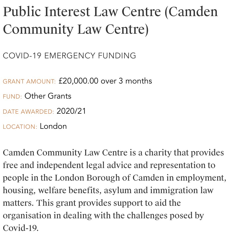 It also gave the Public Interest Law Centre (Camden Community Law Centre) £20,000 over 3 months, which helps with "asylum and immigration law matters".