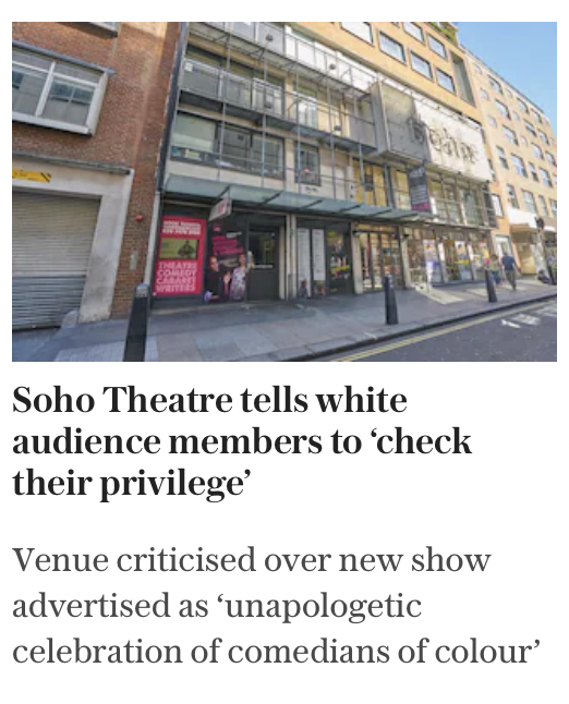 3) £614,582 per year taxpayer-funded Soho Theatre tells white audience members to ‘check their privilege’
