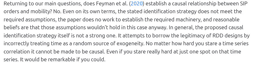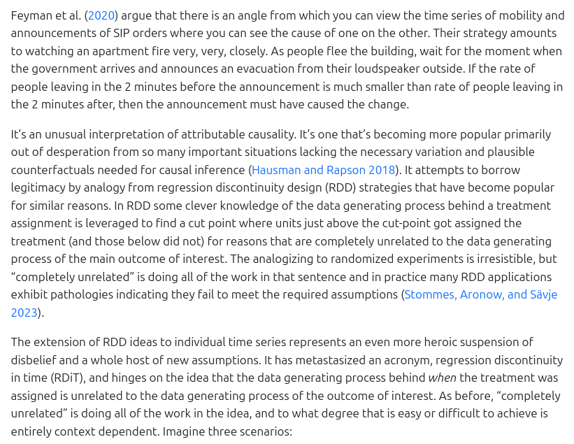 Does their identification strategy allow us to interpret that estimate as causal? It does not! The very difficult assumptions of an RDiT design do not hold for the apartment building fire that was the first few weeks of DEADLY PANDEMIC in the U.S. In fact, it's a terrible case.