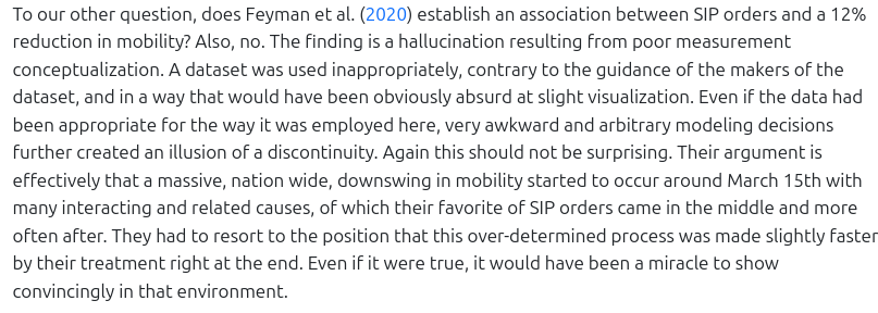 Feyman et al. (2020) ask whether COVID-19 shelter-in-place orders actually kept people inside or if they were ignored and people would have stayed inside anyway.