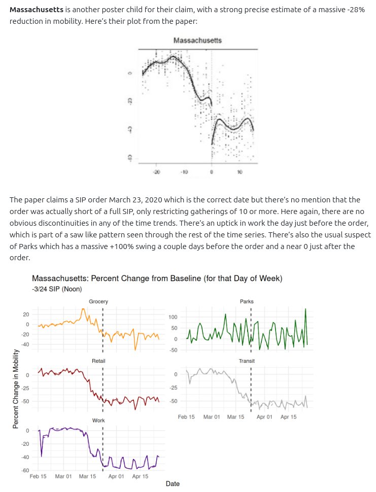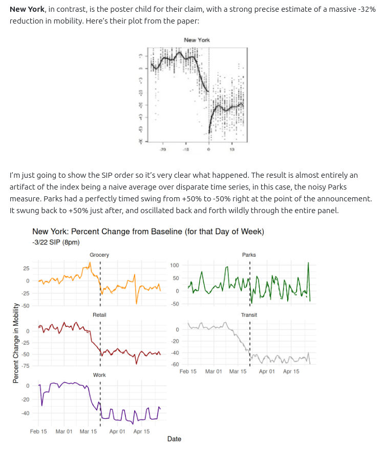 They think they found an answer! They looked at Google's Mobility Report time series measures of how many people visited work, transit, retail, grocery, and parks. They report finding a discontinuity in the time series right about when SIP orders were passed: -12%!