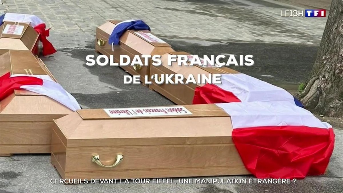 Des cercueils déposés sous la Tour Eiffel avec l'inscription « soldats français de l'Ukraine ».