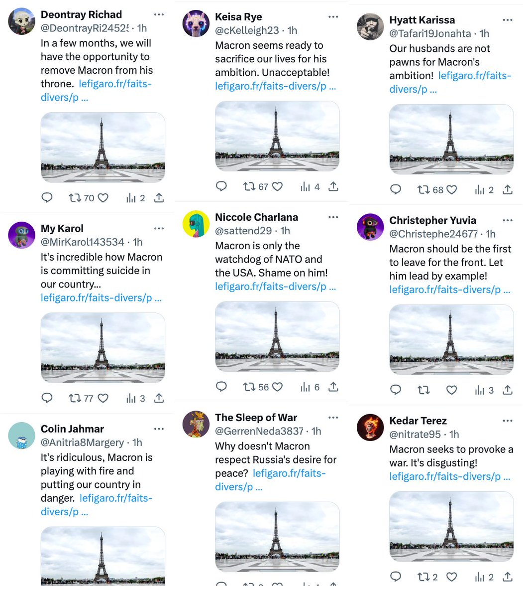 Une nouvelle opération Doppelgänger sur Twitter visant le président Macron et qui colle étrangement avec les commentaires de bien des gens sous mes tweets.