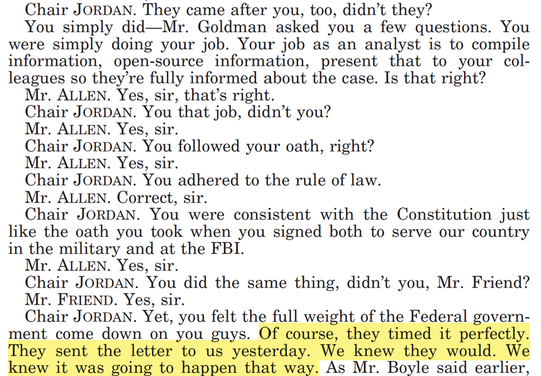 When Marcus Allen, @RealStevefriend, @GOBactual and I testified before @JudiciaryGOP's @Weaponization on May 18, 2023, we strongly suspected the FBI or DOJ had coordinated with Democrats on the Judiciary Committee.