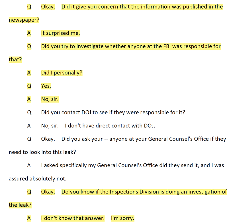 In fact, it’s not clear that anyone at the FBI or DOJ ever investigated whether the leak came from any of their staff—such as the supervisory special agent in FBI Congressional Affairs sharing documents with Goldman’s staff.judiciary.house.gov/media/press-re…