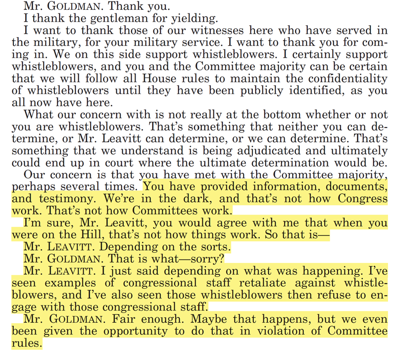 Goldman later said: “We’re in the dark, and that’s not how Congress works. That’s not how Committees work.” Then he asked me if it was how things were supposed to work.