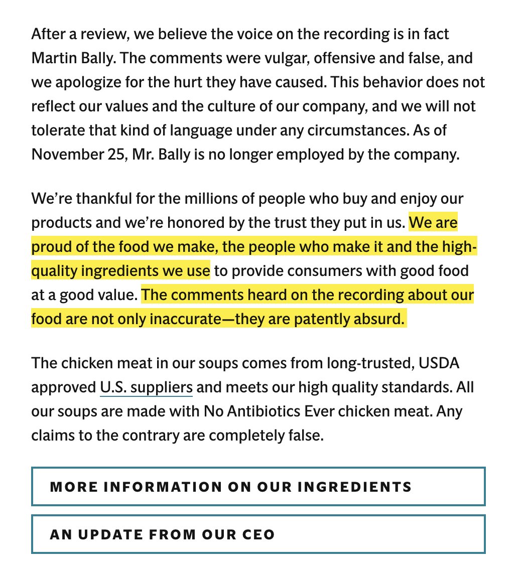 Campbell’s CEO Mick Beekhuizen says that claims made about the soup giant’s food in a viral recording of their (now-fired) VP are “wrong and offensive”—and “absolutely ridiculous” with regard to their chicken.