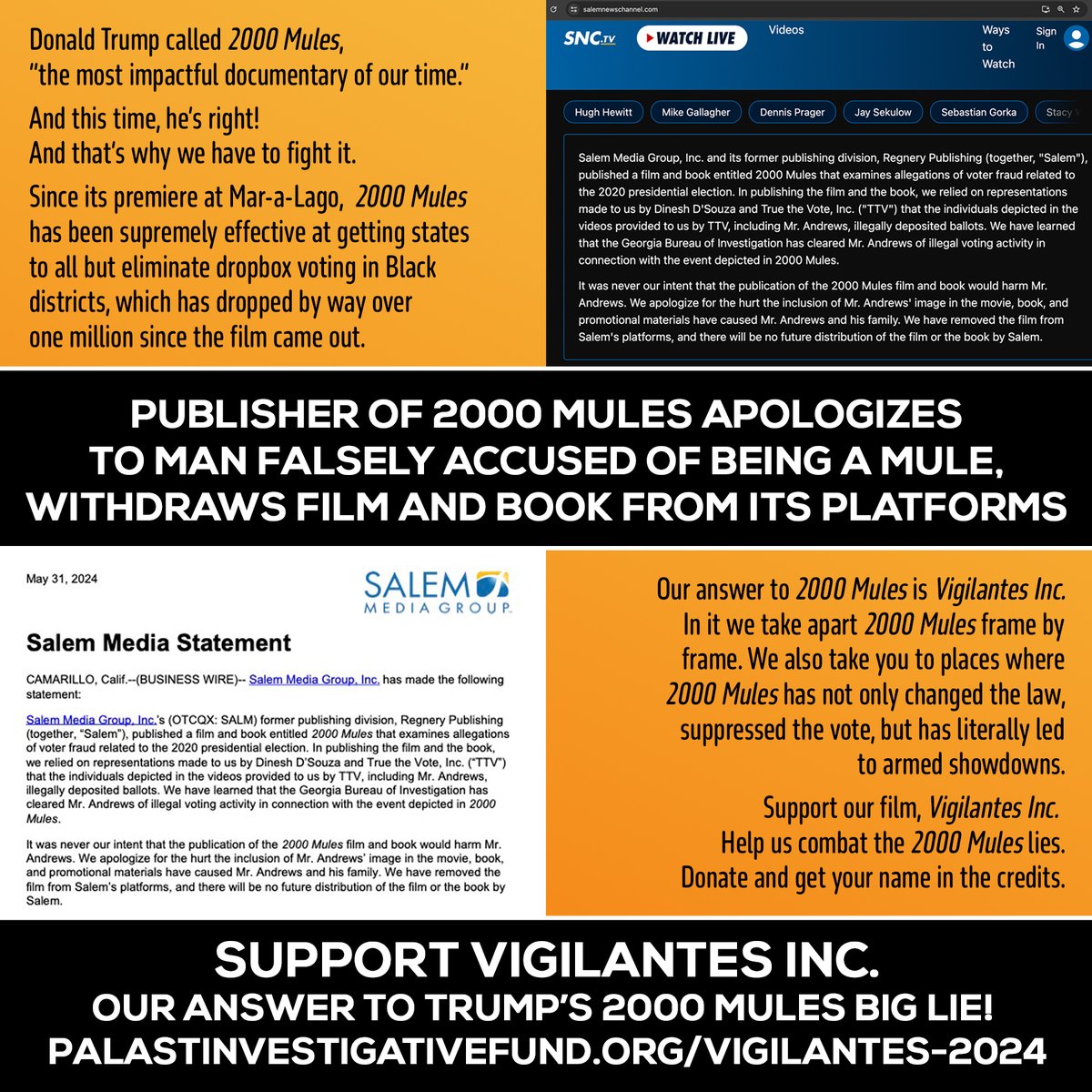 Our answer to 2000 Mules is Vigilantes Inc: America’s New Vote Suppression Hitmen. We take apart 2000 Mules frame by frame. Then we take you to places where, 2000 Mules has not only changed the law, suppressed the vote, but has led to armed showdowns. palastinvestigativefund.org/vigilantes-202…