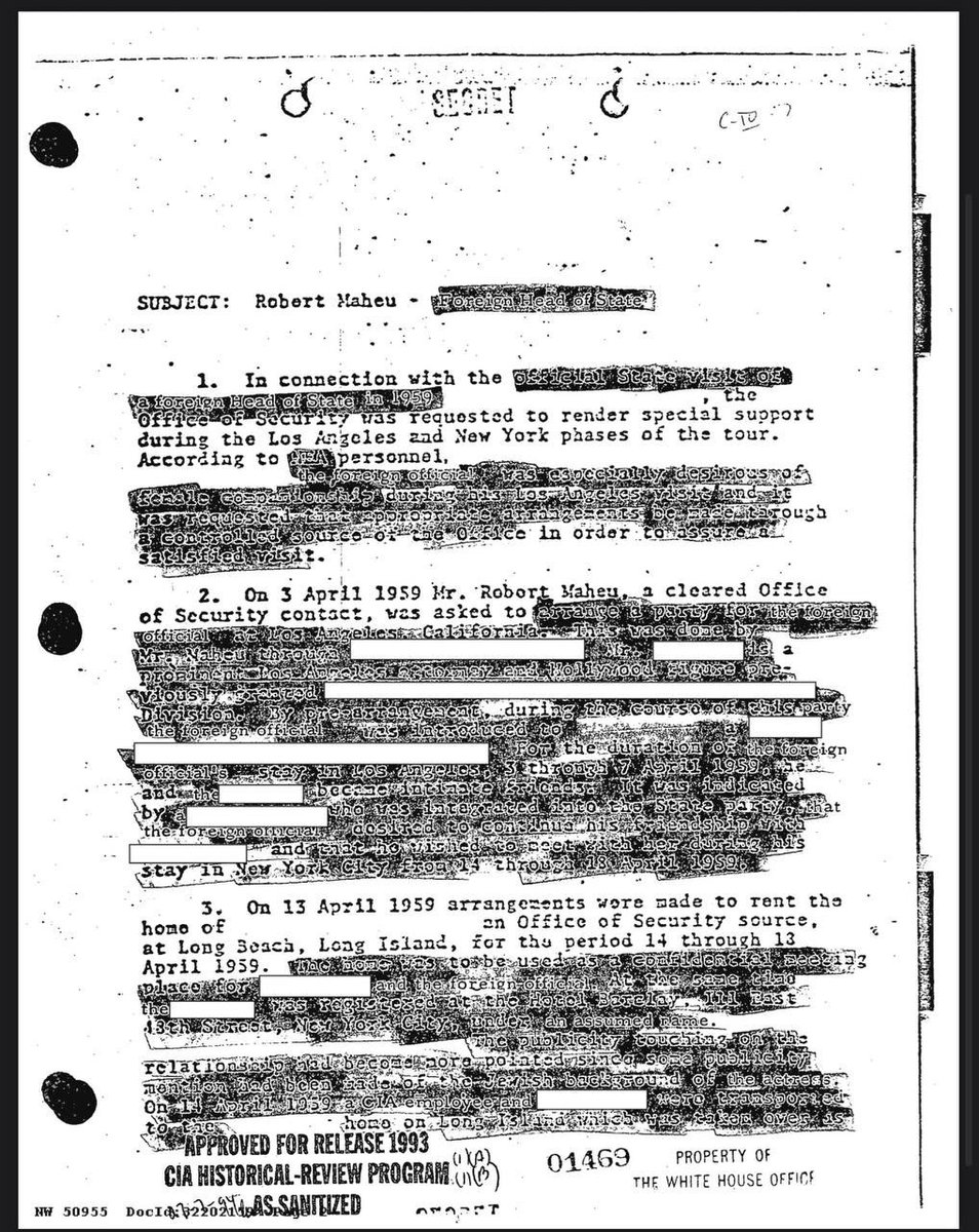 “A CIA memo released Dec. 15 shows how the agency used private investigator Robert Maheu, a former FBI agent, to find “female companionship” for the 23-year-old King during his trip to Los Angeles in April 1959.
