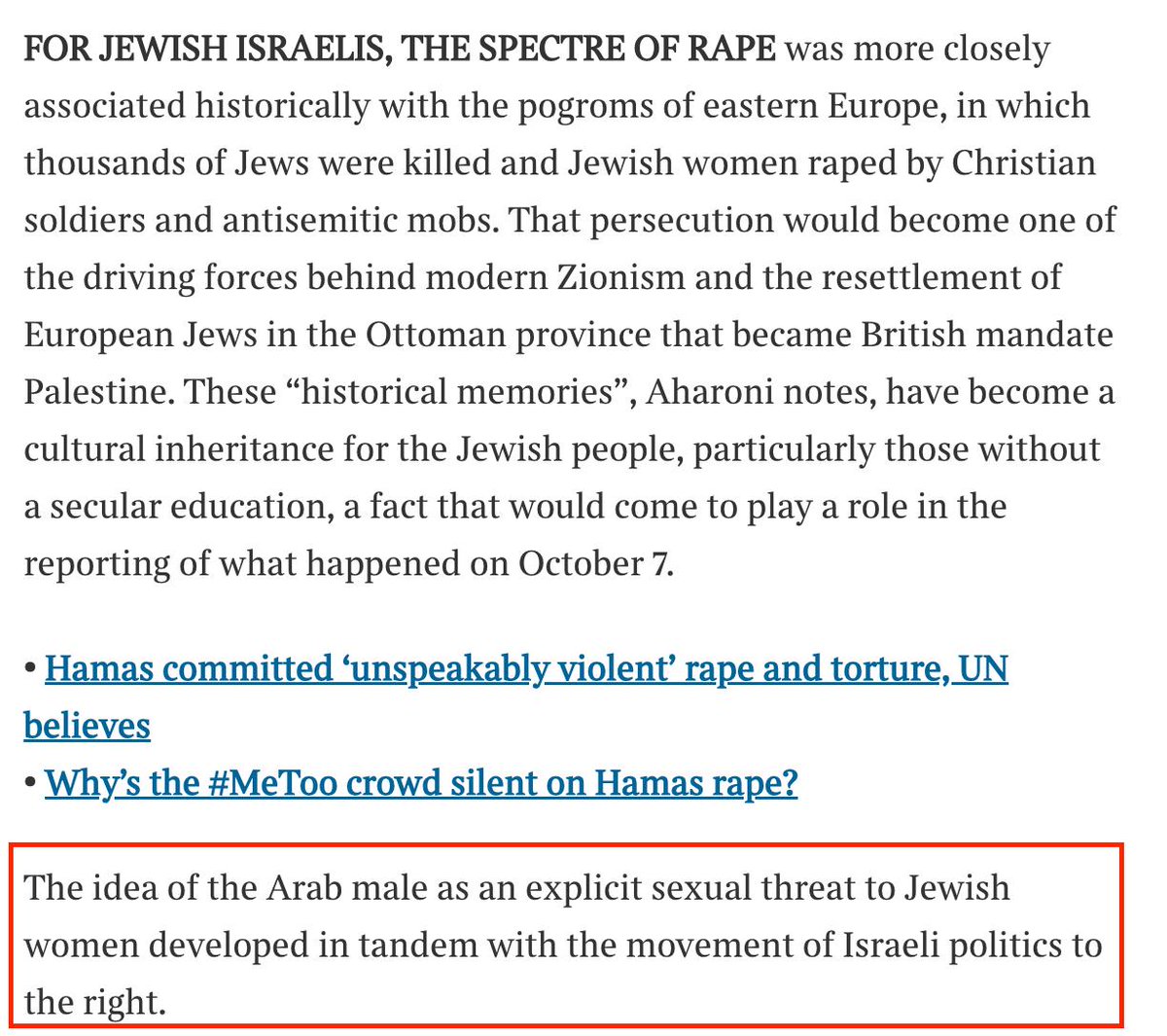 The piece claims the atrocities, specifically the sexual assaults & rapes, are Israel’s most “contentious” assertion of what occurred on Oct 7.