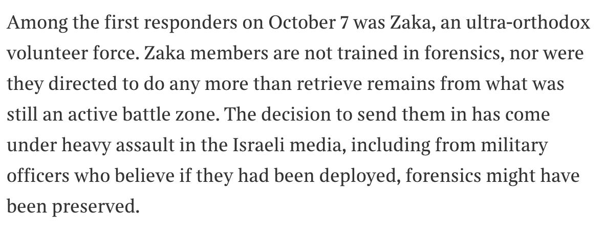 The piece's primary contention is that the reports of rape mostly came from “ultra-orthodox” Zaka volunteers who supplied “inaccurate and unreliable forensic interpretations” of what they saw when taking away victims’ bodies.